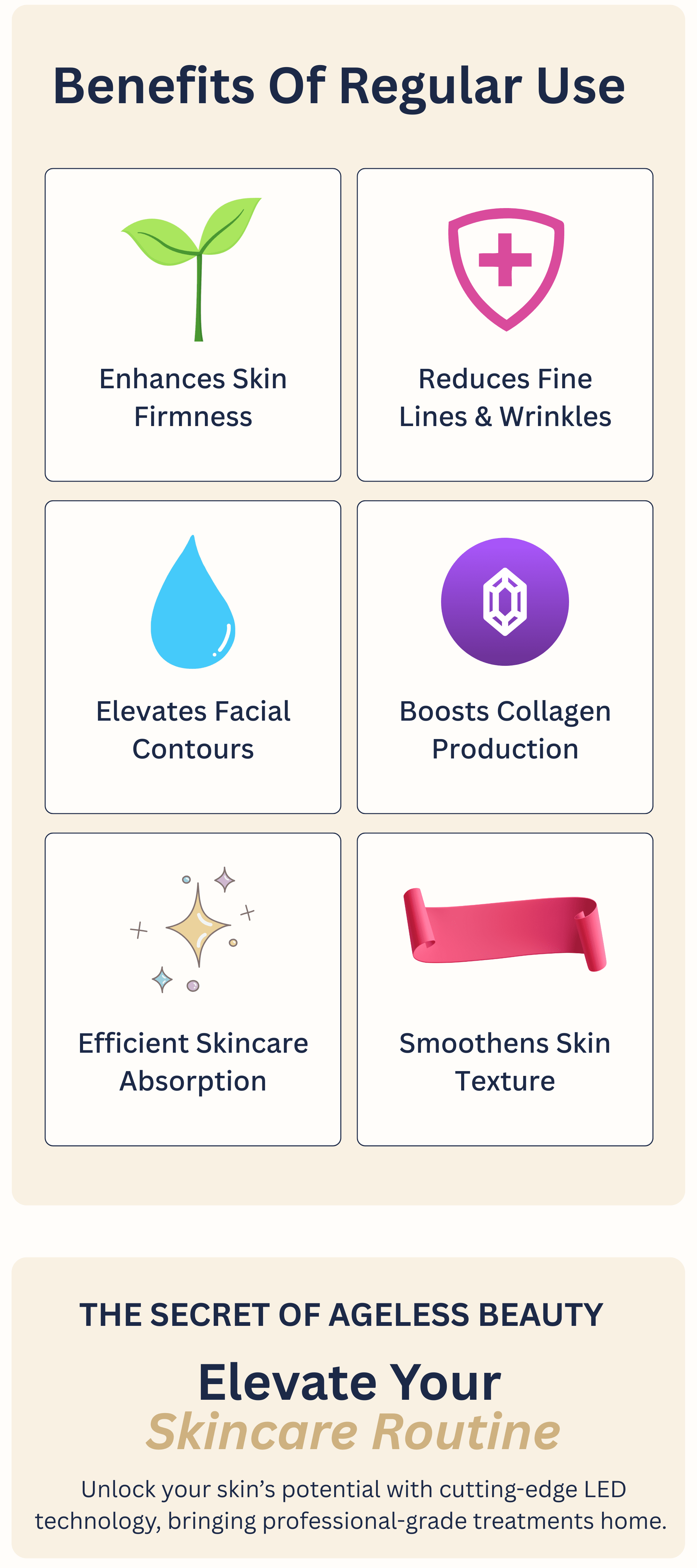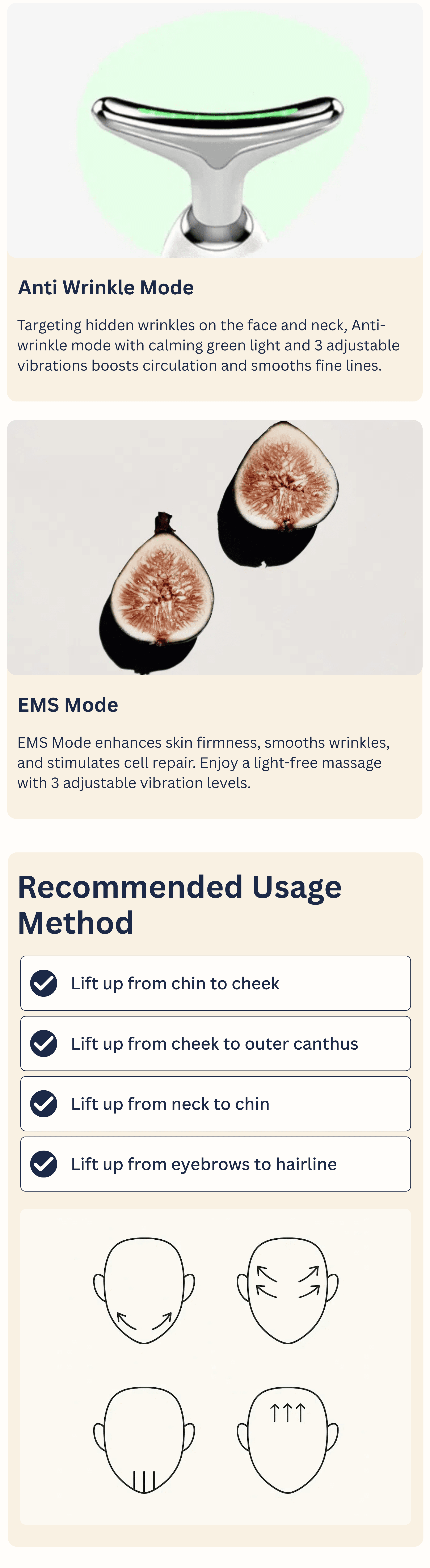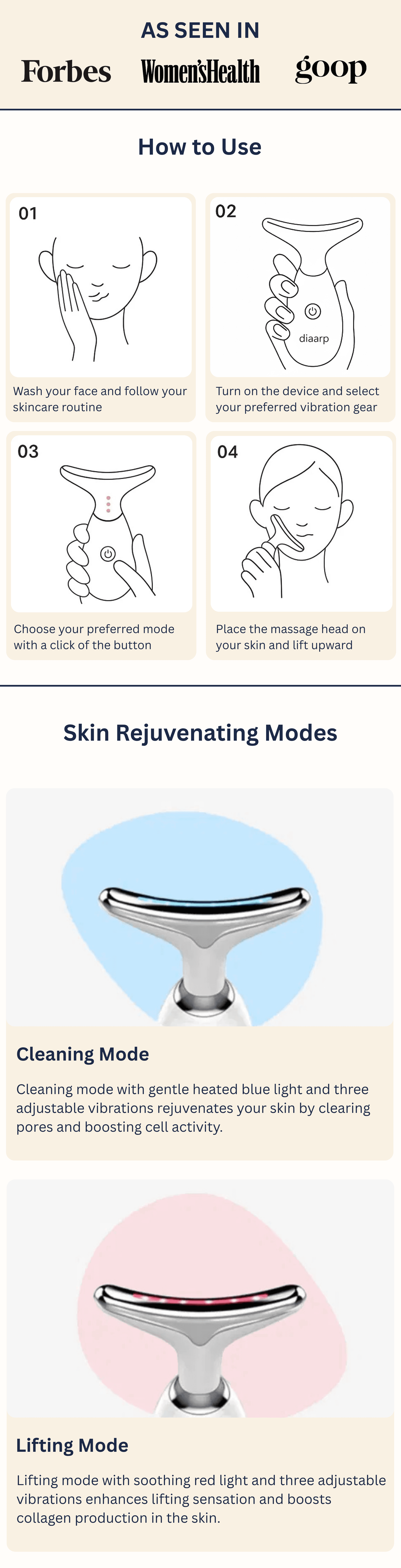It lifts, tightens, and rejuvenates skin using EMS and LED light therapy for a youthful glow.