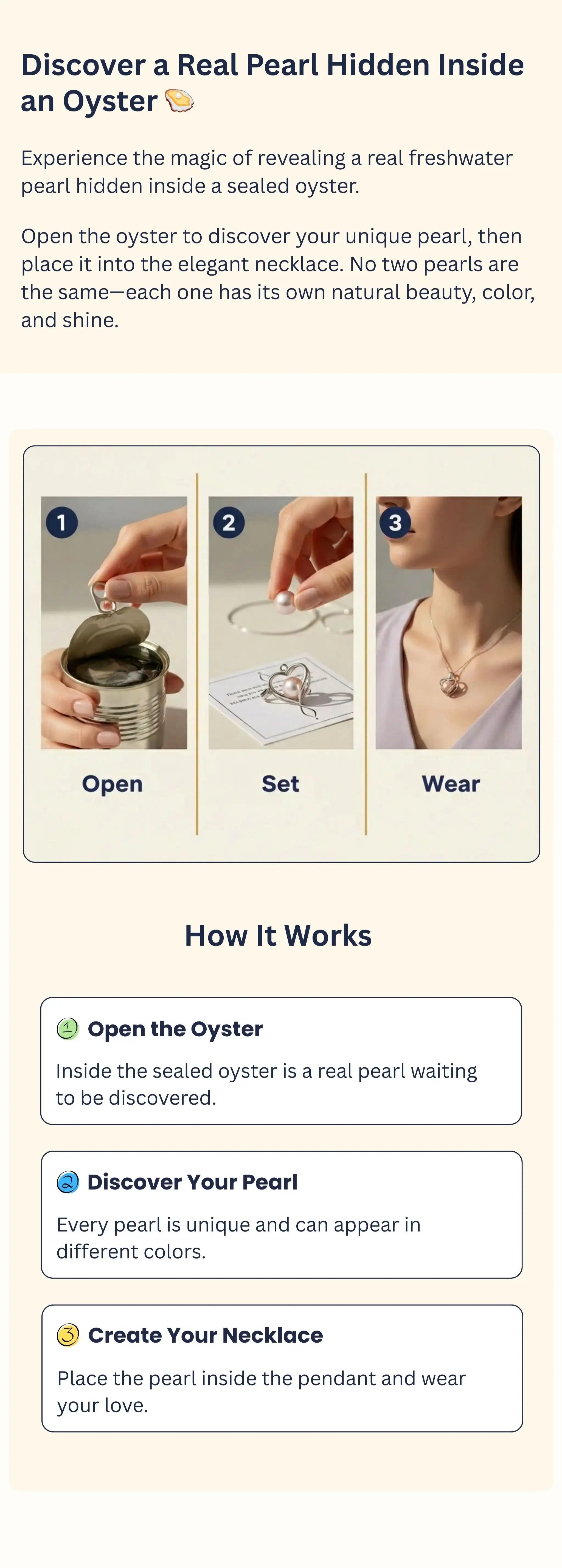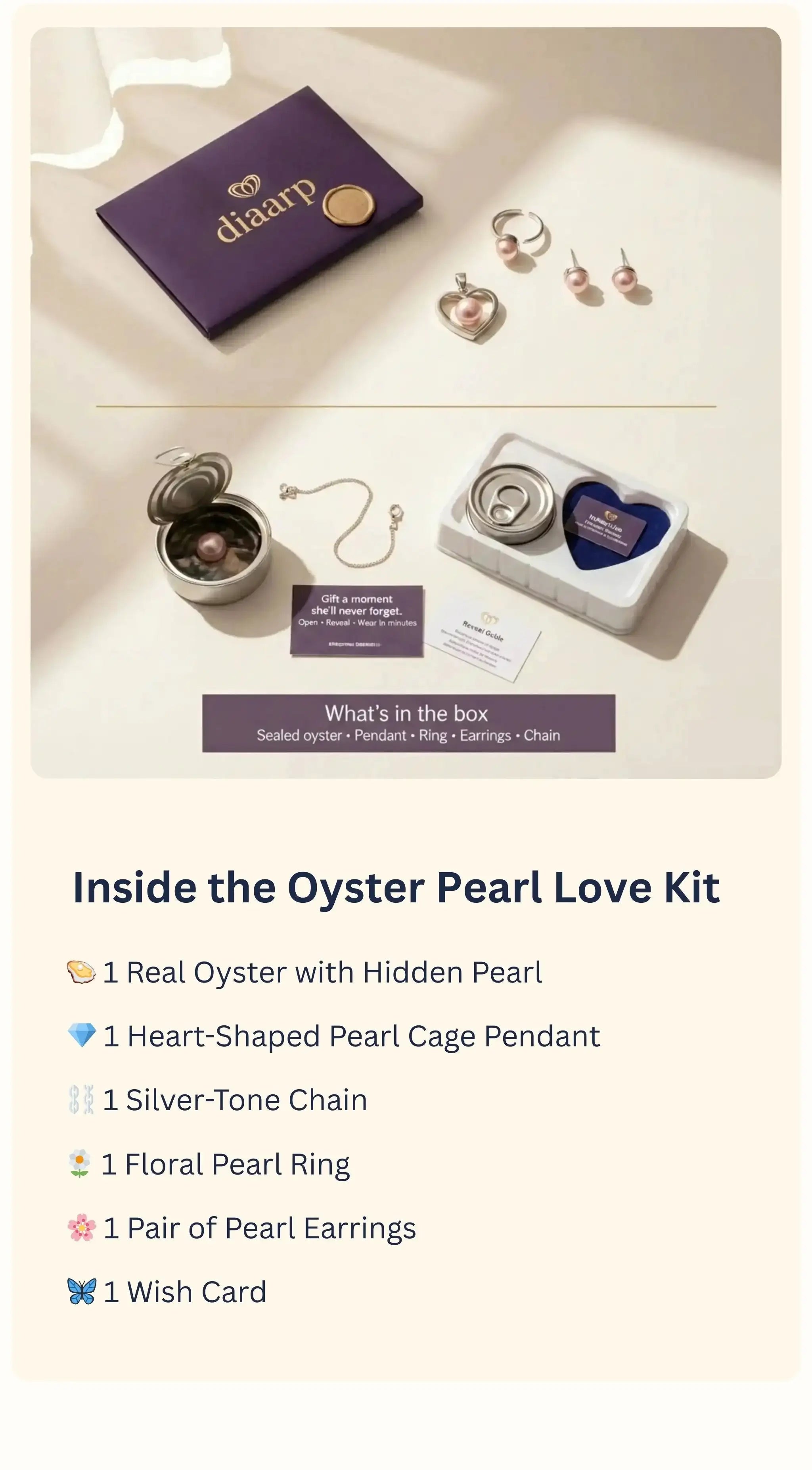 Each set includes 1 oyster with a real pearl, a pearl pendant, a chain, a pair of pearl earrings, and a floral pearl ring.